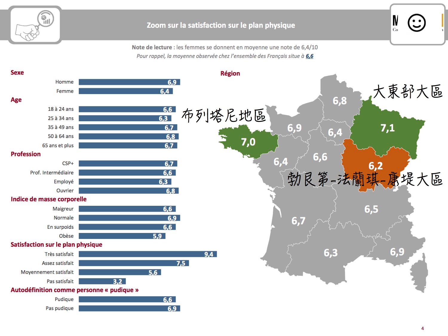 兄弟姊妹鄉親父老們,要找未來的另一半就請去布列塔尼地區及大東部大區(史特拉斯堡所屬區域),各位可能會在那邊,隨時隨地發現顏值身材高於 7 分的天菜。或許是因為左邊有好山好水,右邊有美麗大海,渾天得厚的先天養成啊!而勃艮第雖然排最後一名,但與整體數據來說其實並不算差。