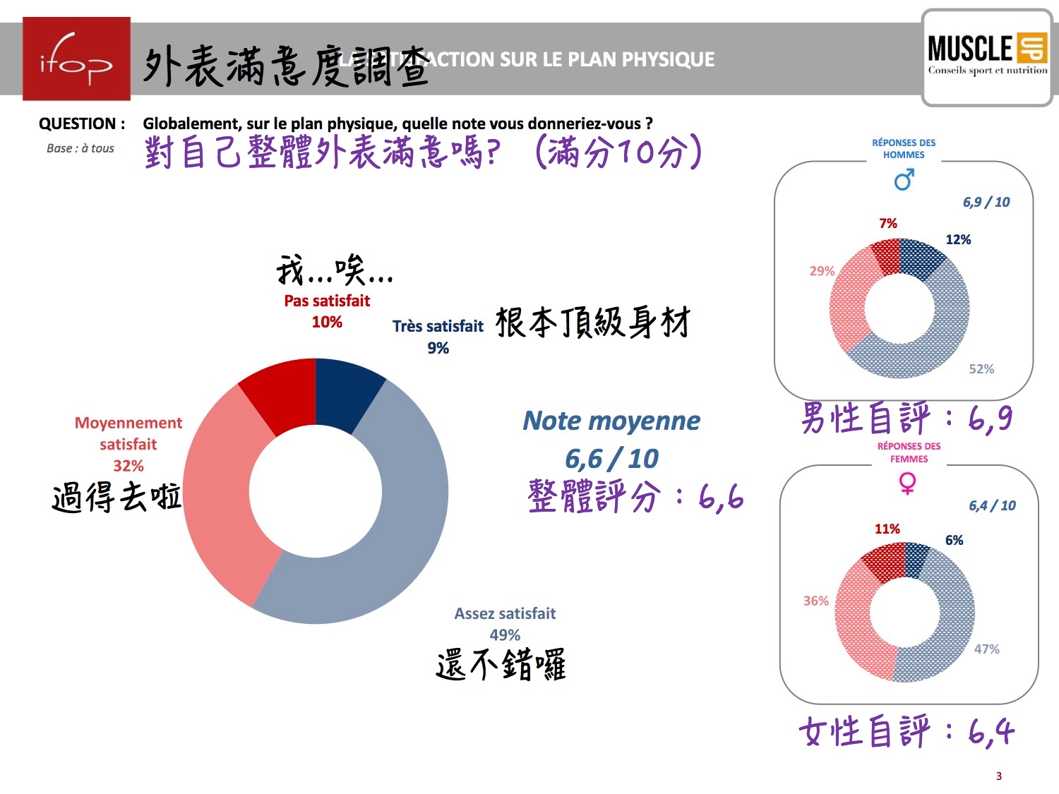 滿分 10 分,法國人對自己外表的滿意度為 6,6 分,也就是超過半數的人覺得自己「還不錯」,而且女性自評比男性還低。