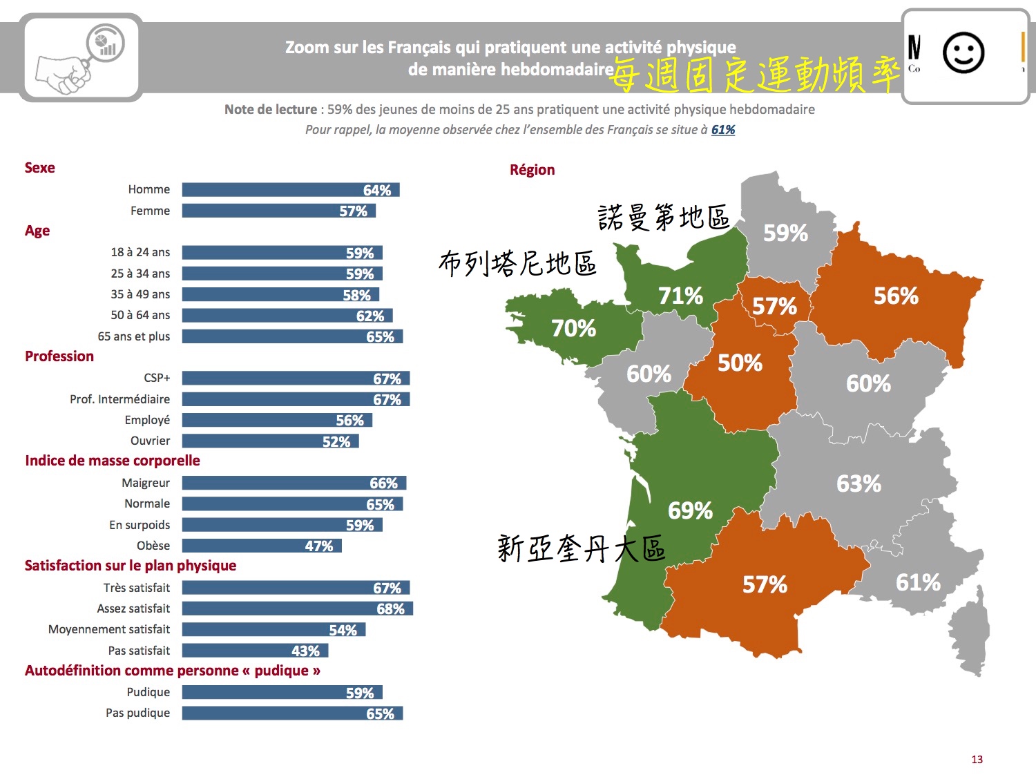 終於看到一篇比較可相信的調查了……不過讓 C’ 為巴黎人解釋一下這比例。在巴黎,就跟在台北一樣,每天就是地鐵、上班、睡覺,週而復始。再加上跟同事、朋友之間的聚會,若非有人督促或自我覺醒,在大城市中確實很難實踐規律運動的習慣。