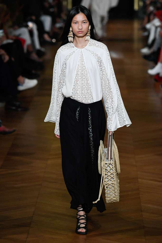 回到時尚秀,我們可以看到Stella McCartney大量交錯粗細線條,黑線或方格,甚至白色透明來襯托出反差與身體的曲線。另,深V或深U洋裝,開衩裙擺,以及中性長板西裝外套等。